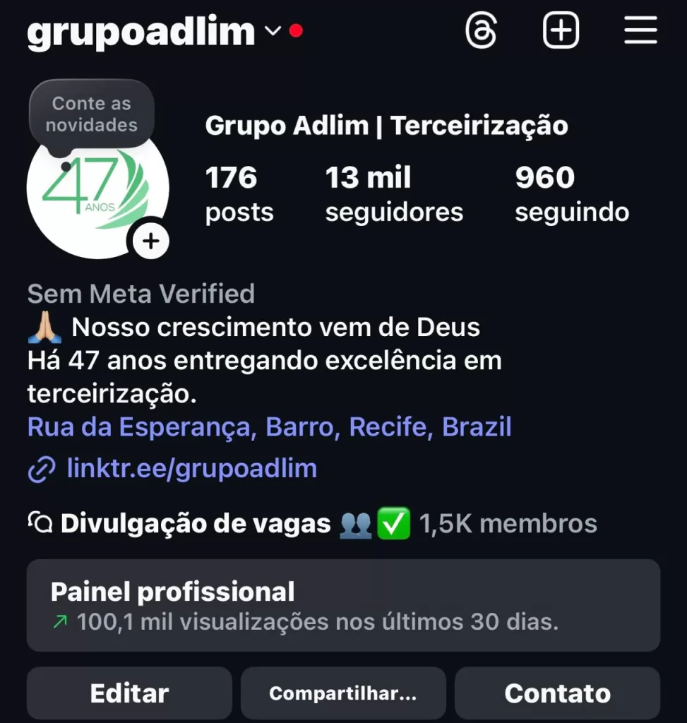 Com apenas 13 mil seguidores, o perfil do Grupo Adlim alcançou mais de 100 mil visualizações em 30 dias, comprovando que estratégia supera volume de audiência.